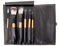 The six brush set includes the Blush Brush #2, Contour Brush #3, Medium Eye Shader Brush #7, Blending Brush #10, Small Angled Brush #13, Mascara/Brown Brush #16, unique brush pouch that rolls keeping your brushes safe and secure The material is synthetic and easy to clean with soap and water.